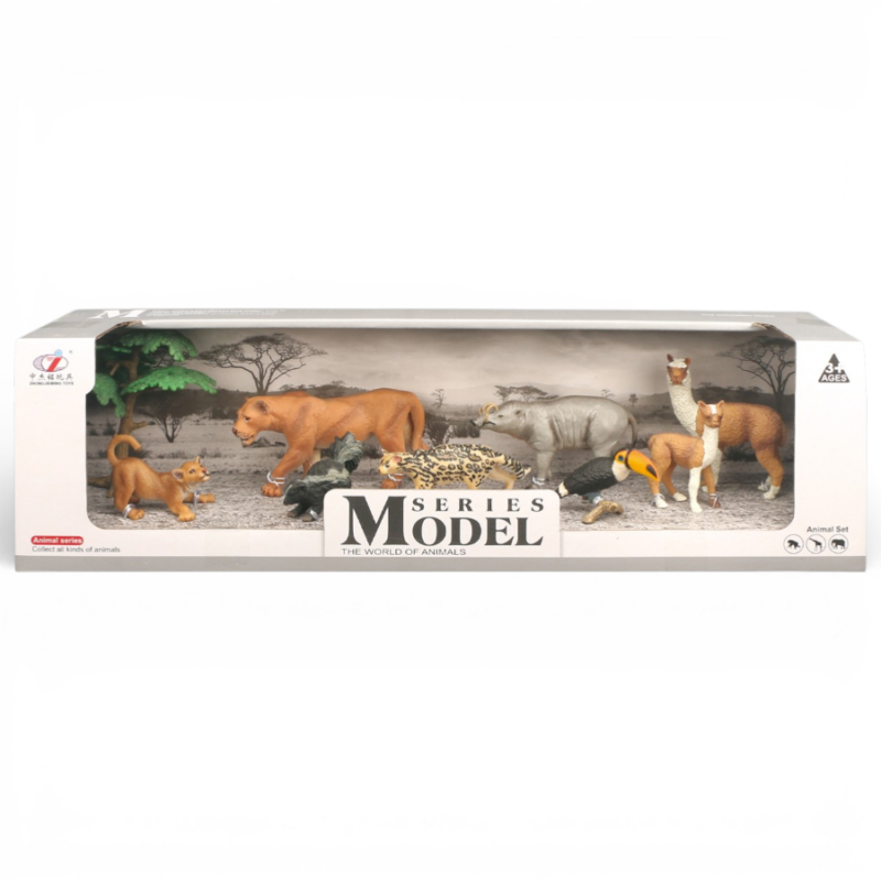 تضم هذه المجموعة 8 مجسمات حيوانات متنوعة مثل اللبؤة، الفهد، وحيد القرن، والطوقان، مما يمنح الأطفال تجربة لعب تعليمية ممتعة تساعدهم على التعرف على الحيوانات المختلفة.