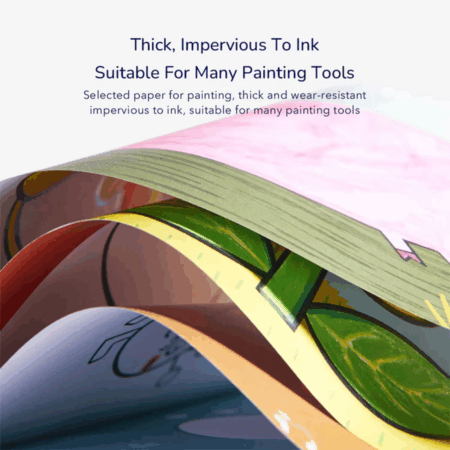 - ورق عالي الجودة: مصنوع من ورق مقوى أبيض سميك مقاوم لتسرب الحبر وتمزقه، مما يوفر سطحًا متينًا للرسم بالألوان المائية.