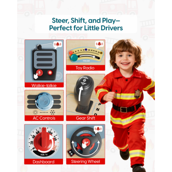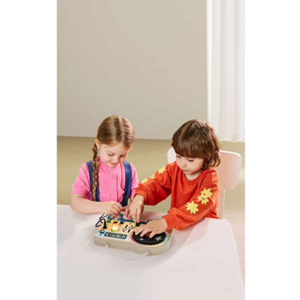 تحتوي اللوحة على قرص DJ دوّار، أزرار مضيئة، مفاتيح تشغيل، مقبض دوران، وسلك توصيل لتوفير تجربة لعب ممتعة تساعد الطفل على تطوير المهارات الحركية الدقيقة والتنسيق بين اليد والعين.