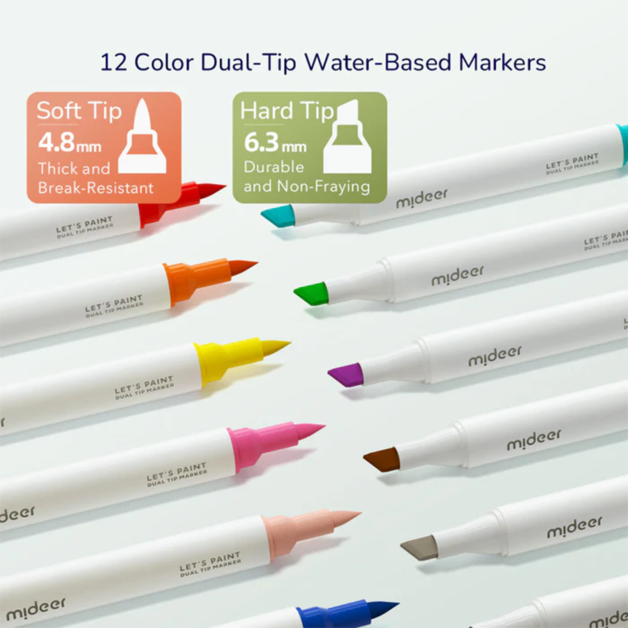 - أقلام تلوين ثنائية الأطراف متعددة الاستخدامات: تتضمن ١٢ قلمًا ثنائي الأطراف، برؤوس ناعمة وحادة، لتأثيرات وتقنيات فنية متنوعة.