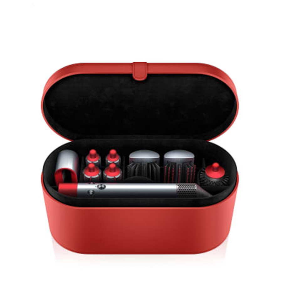 - يحتوي على حقيبة تخزين باللون الاحمر البروسي المبطنة بقماش ناعم تحمي وتخزن بشكل انيق وتتضمن غطاء غير قابل للانزلاق لمصفف الشعر الخاص بكِ