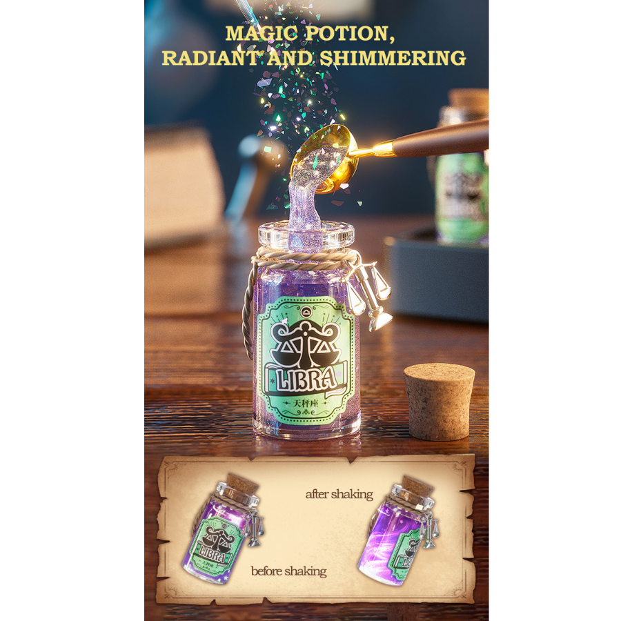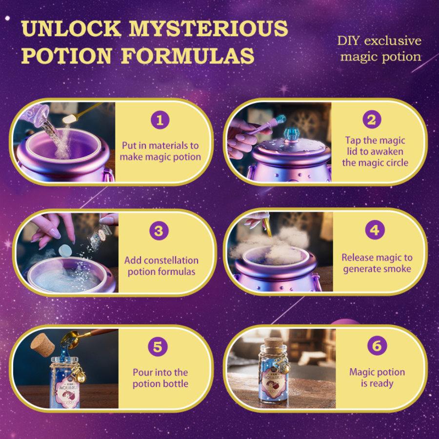 كما تتضمن المجموعة 15 نوعًا من الجرعات المرتبطة بالأبراج الفلكية يمكن للأطفال جمعها وتخزينها في زجاجات صغيرة جميلة أو حملها كتعليقة سحرية.