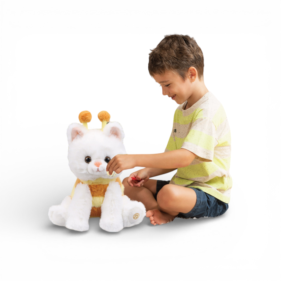 لعبة قطة تفاعلية محشوة بتصميم لطيف وناعم توفر تجربة لعب ممتعة للأطفال. تأتي القطة مع نحلة صغيرة تفاعلية يمكن وضعها على وجه القطة لتتفاعل معها بطريقة مرحة، مما يجعل الأطفال يستمتعون باللعب والتفاعل معها لفترة طويلة.
