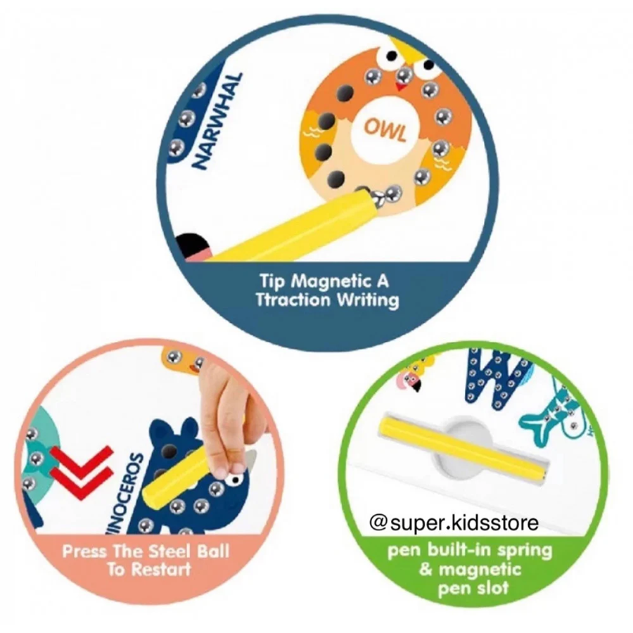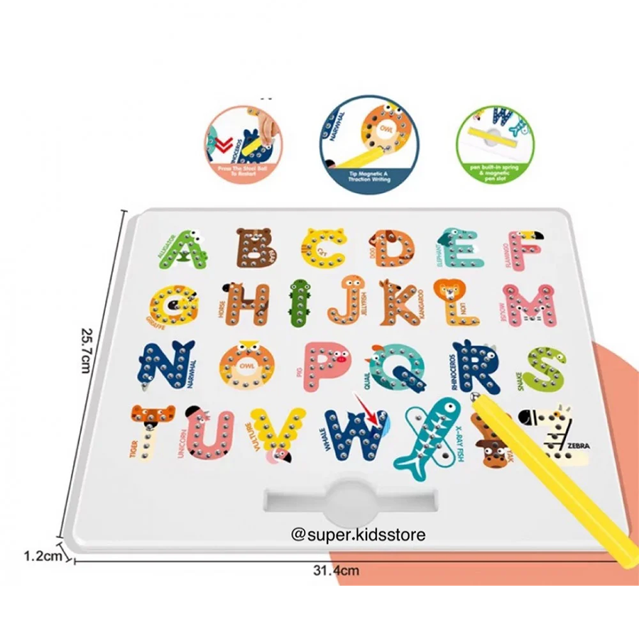 لوح كتابة مغناطيسية مخصص للصغار لتعليمهم كيفية كتابة الحروف الإنجليزية وتطوير مهاراتهم بطريقة أكثر سهولة وابتكاراً دع طفلكيتدرب على كتابة 26 حرفاً بشكل صحيح عن طريق تتبع الأسهم باستخدام القلم المغناطيسي على الخرزات التي تشكّل كل حرف علىحدى.