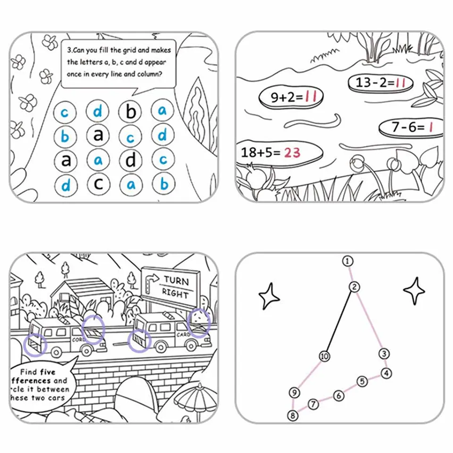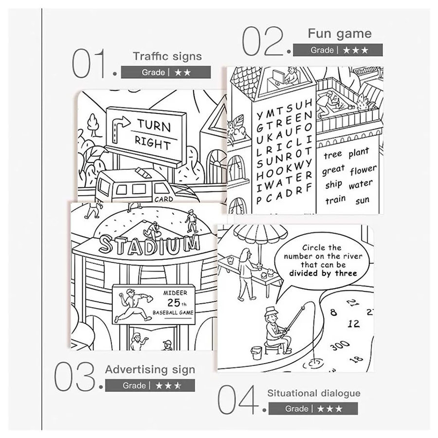 - كما توجد أنشطة داخلها ليتعلم طفلك ويستكشفها! ألا تجد مساحة كافية؟ لوّن رسومات الخطوط التفصيلية قسمًا تلو الآخر! قصّ ولفّ الجزء النهائي، ثم افرد جزءًا جديدًا كما يحلو لك!