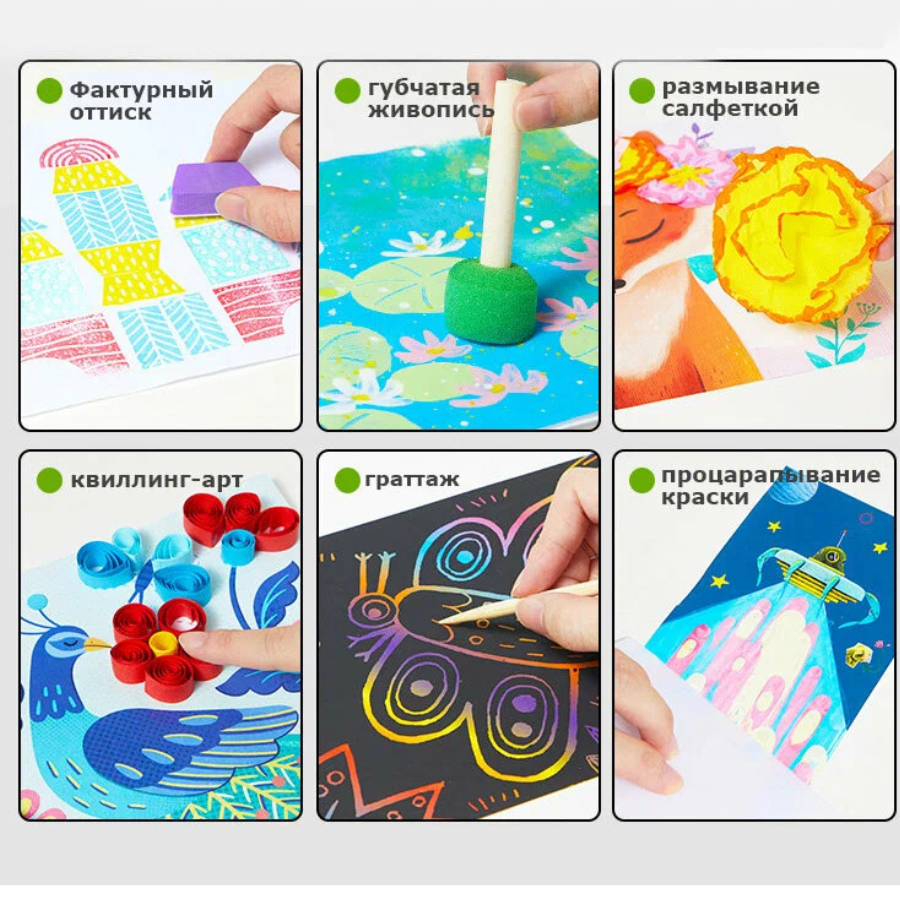 بفضل تنوع الأدوات والخامات، يمكن للأطفال تجربة تقنيات فنية مختلفة والاستمتاع بساعات طويلة من اللعب الإبداعي.