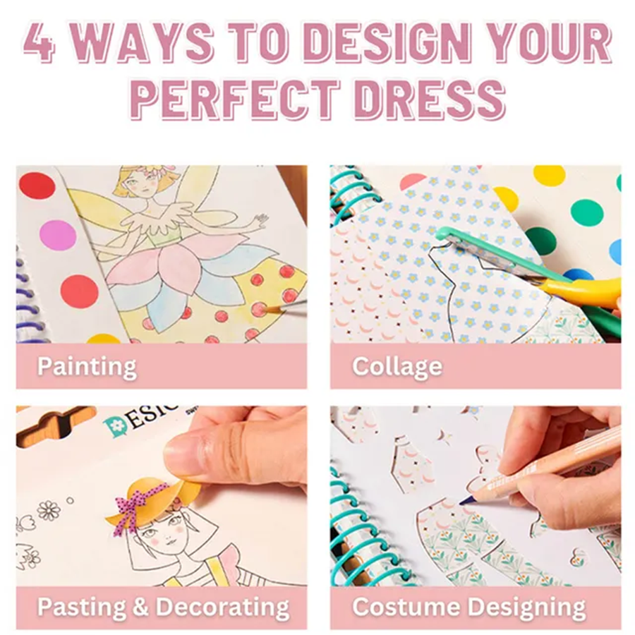 - تتضمن المجموعة مجموعة من المواد والأدوات التي يمكن للأطفال استخدامها لتصميم فساتينهم الخاصة.