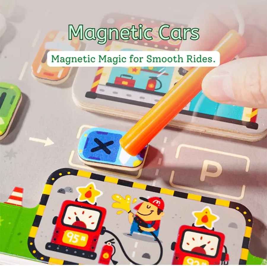 - المتاهة المغناطيسية مصنوعة من خشب الزيزفون عالي الجودة ذو الحواف الناعمة، وتضمن تجربة لعب آمنة ومتينة. تتميز السيارات المغناطيسية بسهولة المناورة بفضل قوة الجر، مما يُعزز التنسيق بين اليد والعين والمهارات الحركية الدقيقة. فتحة مخصصة للقلم المغناطيسي تضمن عدم ضياعه، مما يجعل تخزينه سهلاً. مثالية للأطفال الصغار، تجمع هذه اللعبة بين التعليم واللعب الغامر.