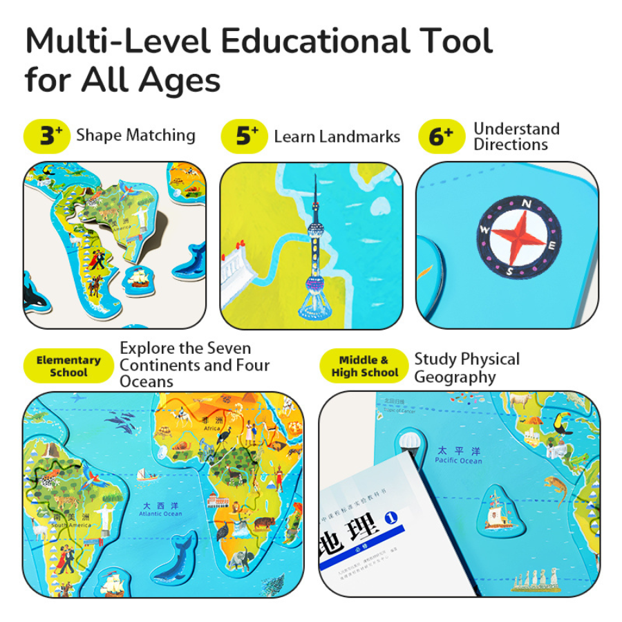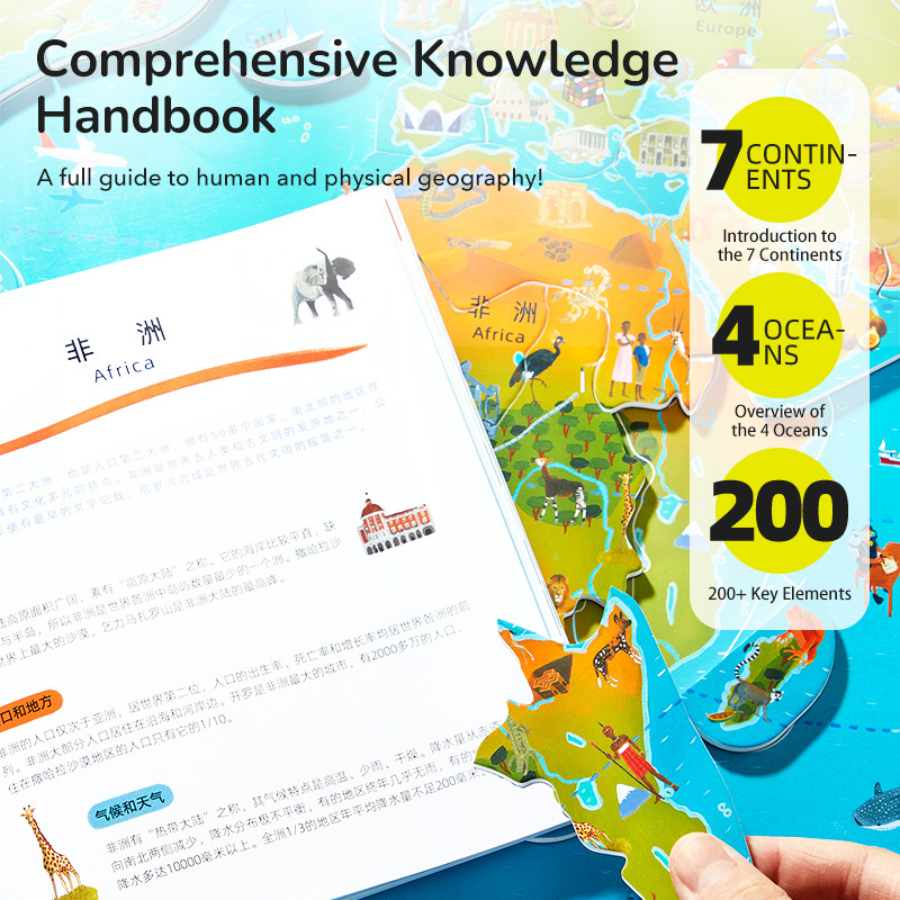 كما يتضمن المنتج كتيبًا تعليميًا غنيًا بالمعلومات يعرّف الأطفال على القارات السبع والمحيطات الأربعة وأكثر من 200 عنصر جغرافي وثقافي حول العالم.