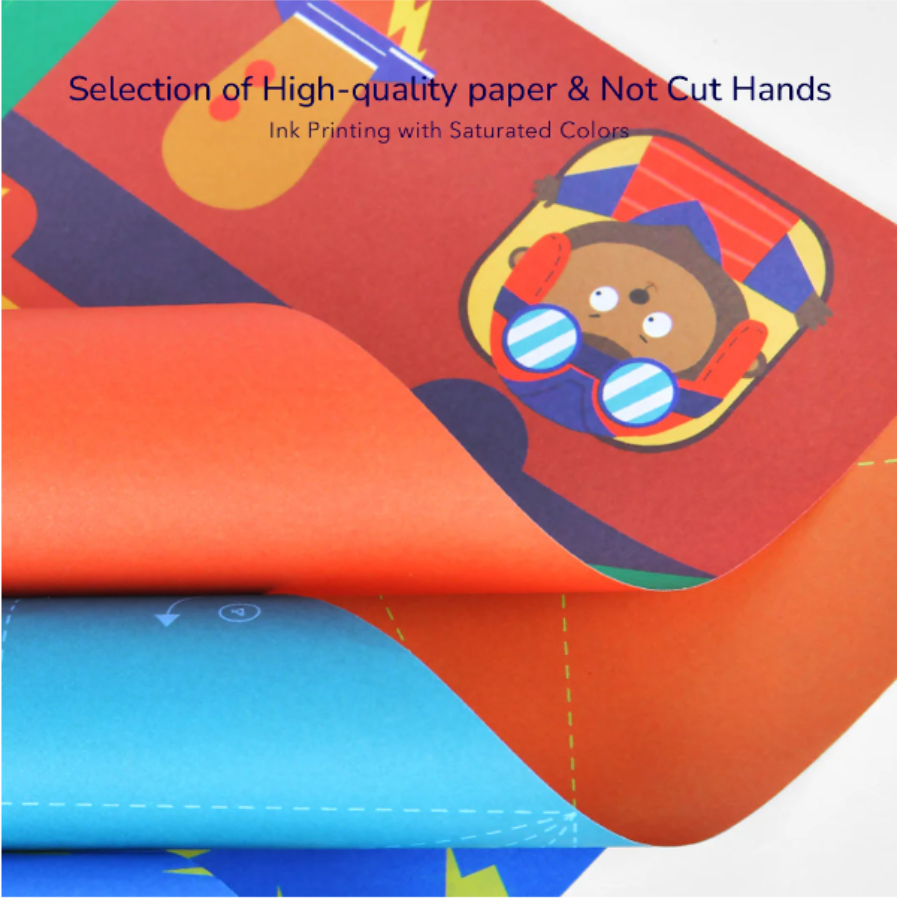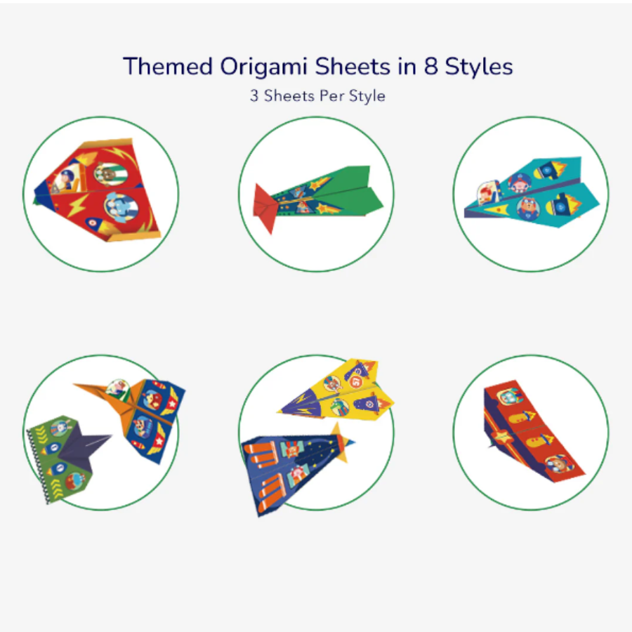 تتميز الأوراق برسومات جذابة وألوان زاهية تزيد من متعة اللعب، كما تتضمن المجموعة دليلًا مصورًا يشرح طريقة طي الطائرات المختلفة بسهولة. يمكن للأطفال بعد الانتهاء من الطي إطلاق الطائرات وتجربة الطيران ومقارنة المسافات.