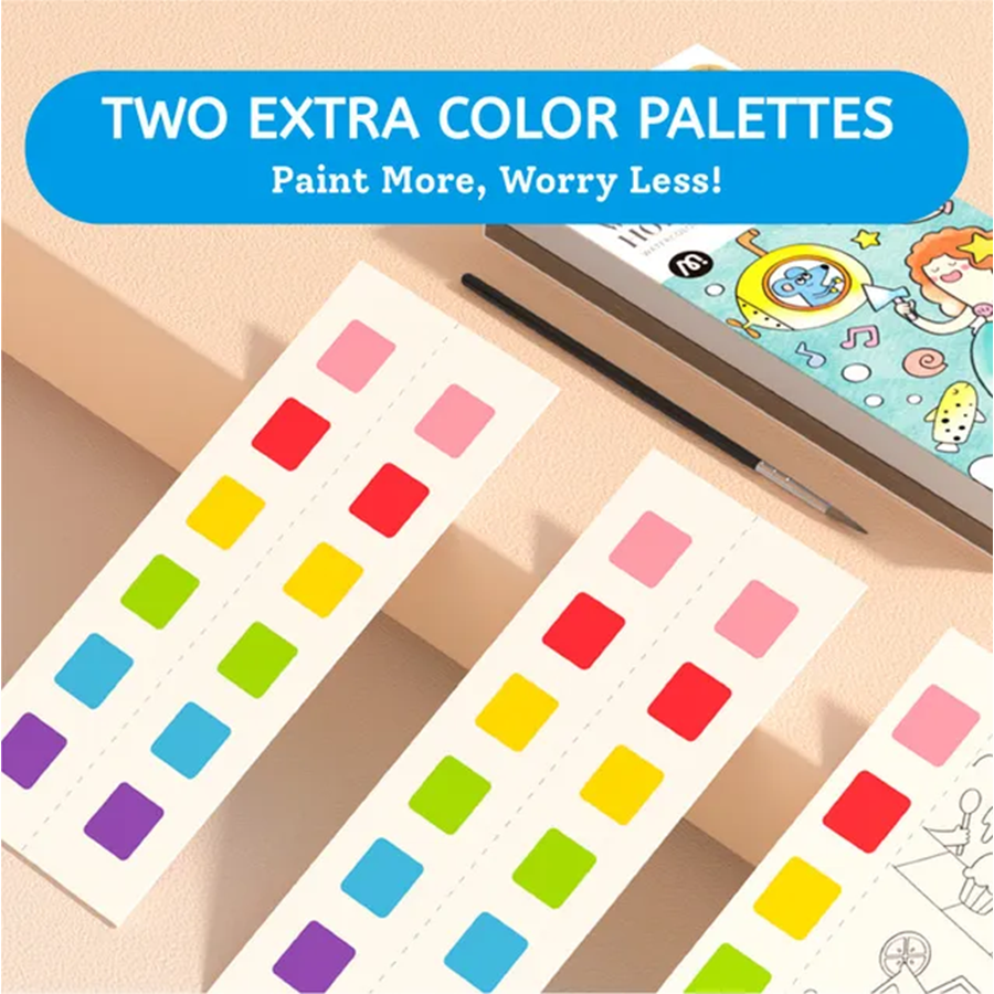 - يحتوي كتاب الرسم على عينات ألوان لكل ورقة. ما عليك سوى بلّل فرشاة الرسم المرفقة بقليل من الماء، ثم امسحها برفق على عينات الألوان، ثم لون الصورة لإنشاء تحفتك الفنية الخاصة! تصميمه المحمول والمدمج يجعله رفيق سفر مثالي لطفلك. يمكن تمزيق عينات الألوان بسهولة بعد الانتهاء من الرسم، ويمكن استخدامها كعلامة مرجعية أو لصقها على الثلاجة لعرض أعمال طفلك بفخر.