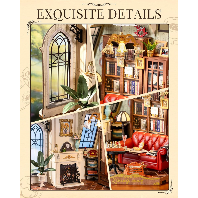 يقدّم هذا المجسم مساحة معيشة متكاملة بتفاصيل مذهلة، من النوافذ الزجاجية المزخرفة، إلى المكتبة الكلاسيكية، والمدفأة الأوروبية، والأريكة الجلدية الحمراء الفاخرة، بالإضافة إلى عناصر ديكور دقيقة مثل الهاتف القديم، اللوحات، والنباتات. كل زاوية في هذا التصميم تعكس ذوقًا راقيًا وحضورًا كلاسيكيًا مميزًا.