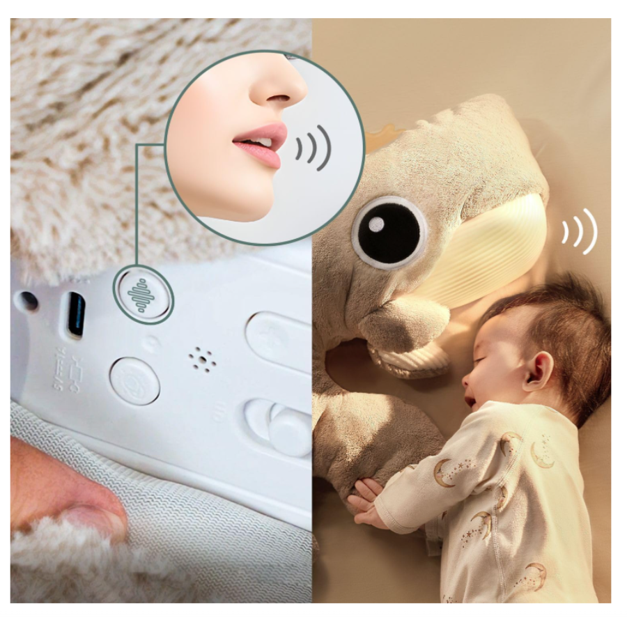 يحتوي الحوت على مستشعر صوت ذكي يكتشف بكاء الطفل ويقوم تلقائيًا بتفعيل وظائف التهدئة مثل الأصوات المريحة، الإضاءة الناعمة، وحركات اللمس اللطيفة لمساعدة الطفل على الاسترخاء والنوم بسرعة.