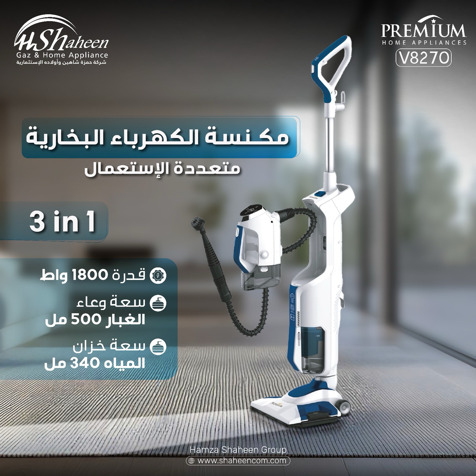 مكنسة كهربائية بخارية متعددة الاستعمالات 3 في 1، تجمع بين التنظيف العميق بالبخار وشفط الغبار بكفاءة عالية. بقدرة 1800 واط وسعة خزان ماء 340 مل ووعاء غبار 500 مل، لتجربة تنظيف سهلة وسريعة تناسب جميع احتياجات المنزل.