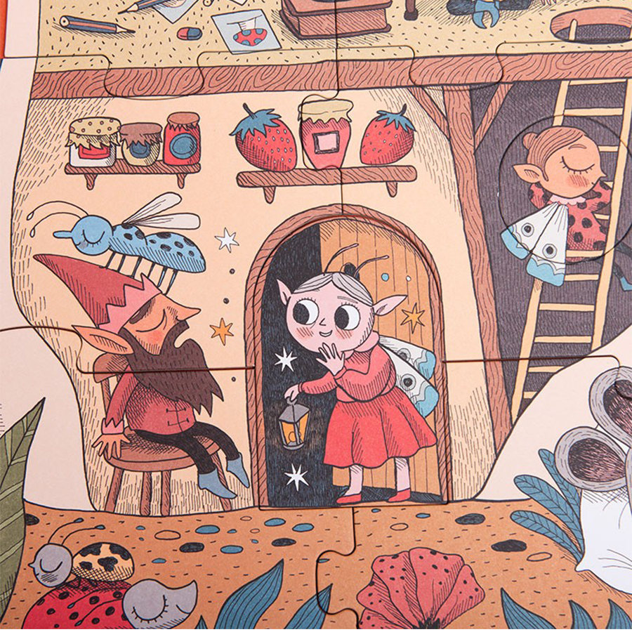 - على أحد الجانبين نجد الجزء الخارجي من الفطر وعلى الجانب الآخر الجزء الداخلي. بمجرد تجميع بيت الفطر (10 قطع)، سيتمكن الطفل من وضع القطع داخل المنزل (8 قطع)، مما يجعل الشخصيات المختلفة تنام، وفي نفس الوقت يعتاد على عادة النوم. القطع كبيرة جدًا ومصممة للأيدي الصغيرة.