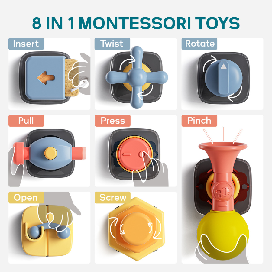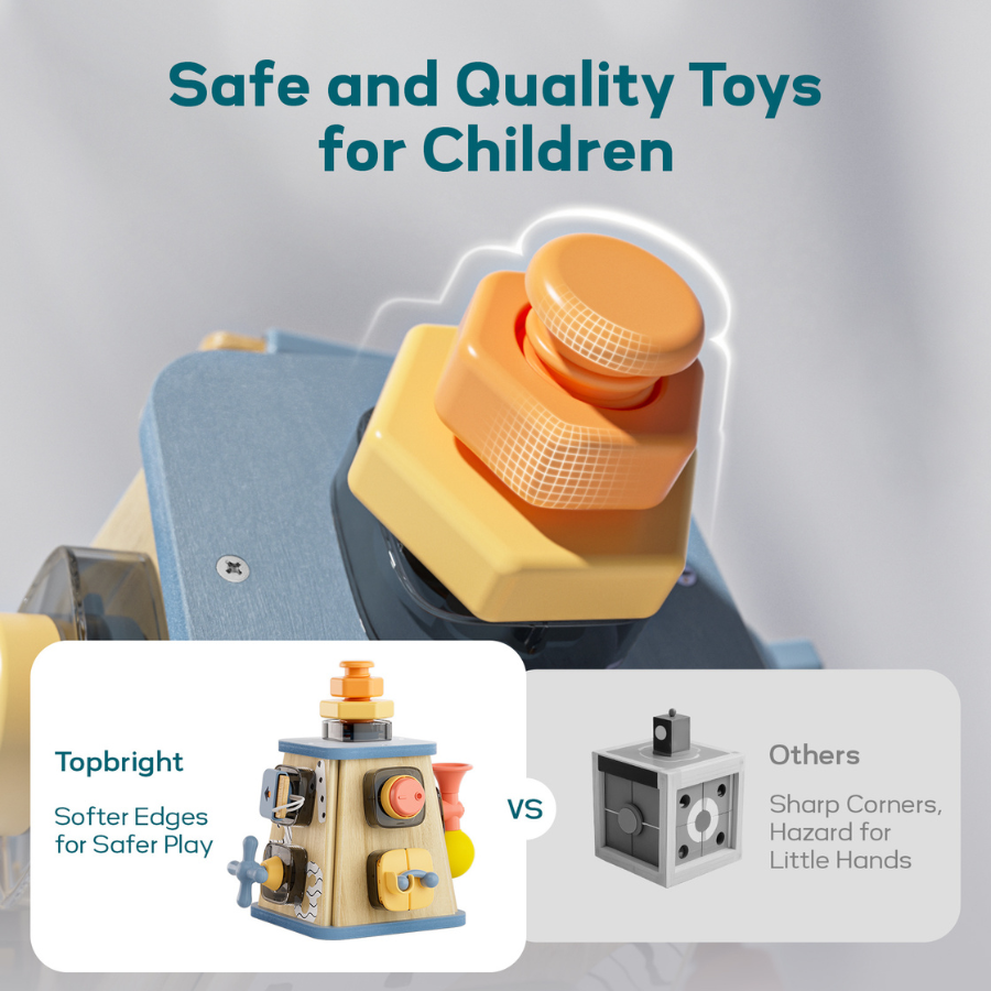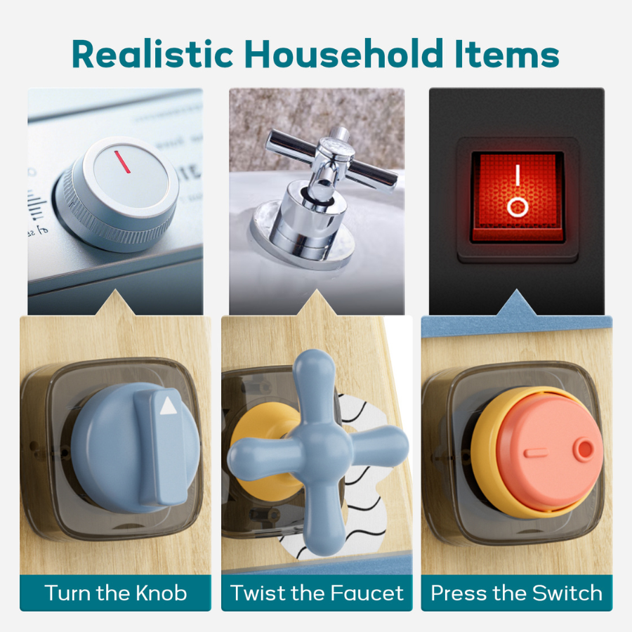 يحتوي هذا البرج على عدة أنشطة مختلفة مثل الأزرار، المفاتيح، المقابض، والعجلات الدوارة، مما يسمح للأطفال باستكشاف الحركات المختلفة وتنمية مهاراتهم الحركية الدقيقة.