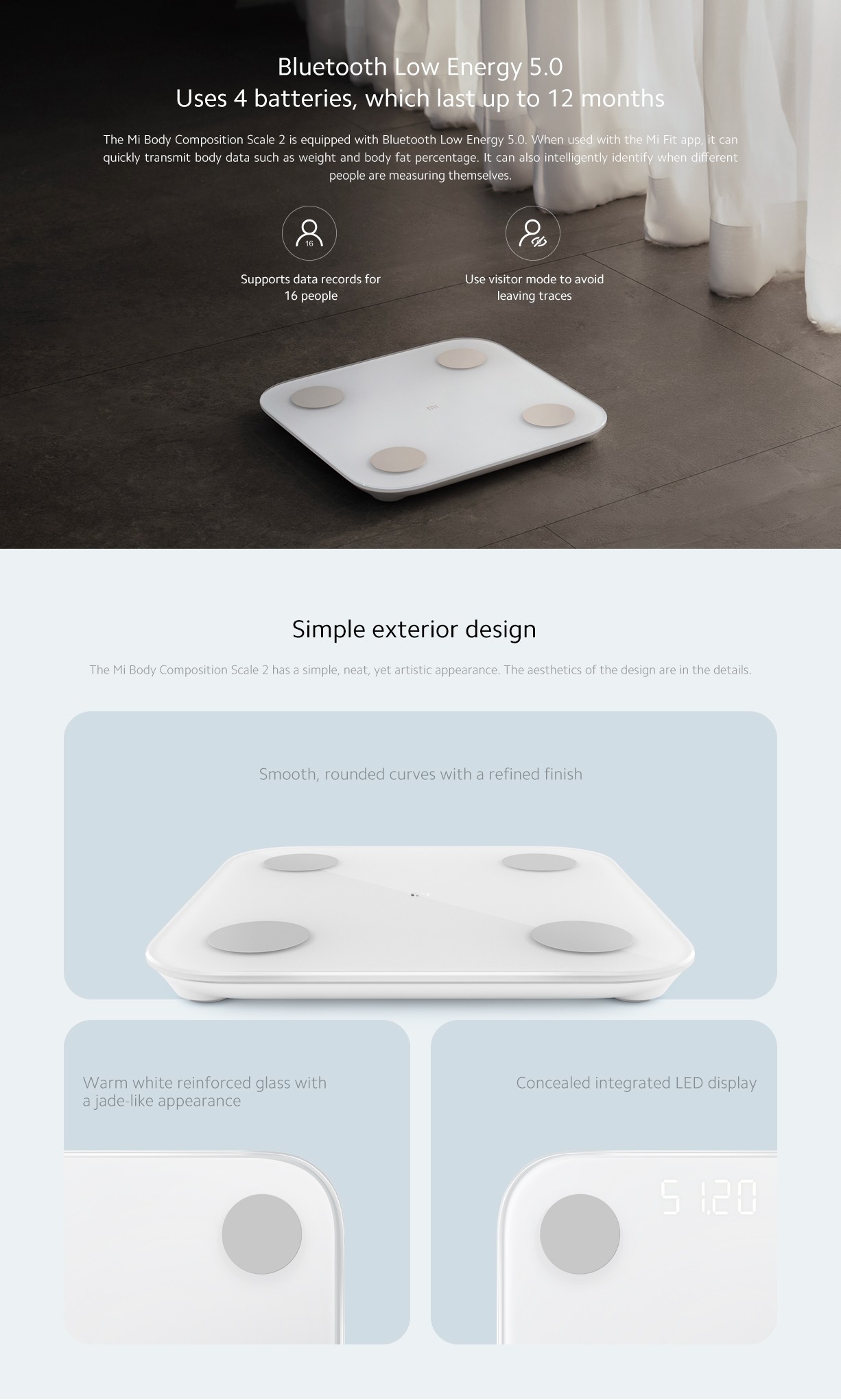 مقياس ذكي وعالي الجودة من Xiaomi يعرض الوزن الدقيق ، و 13 معيارًا مختلفًا لبيانات الجسم القابلة للقياس ، وله نطاق وزن يصل إلى 150 كجم ويسمح بالتتبع عبر التطبيق